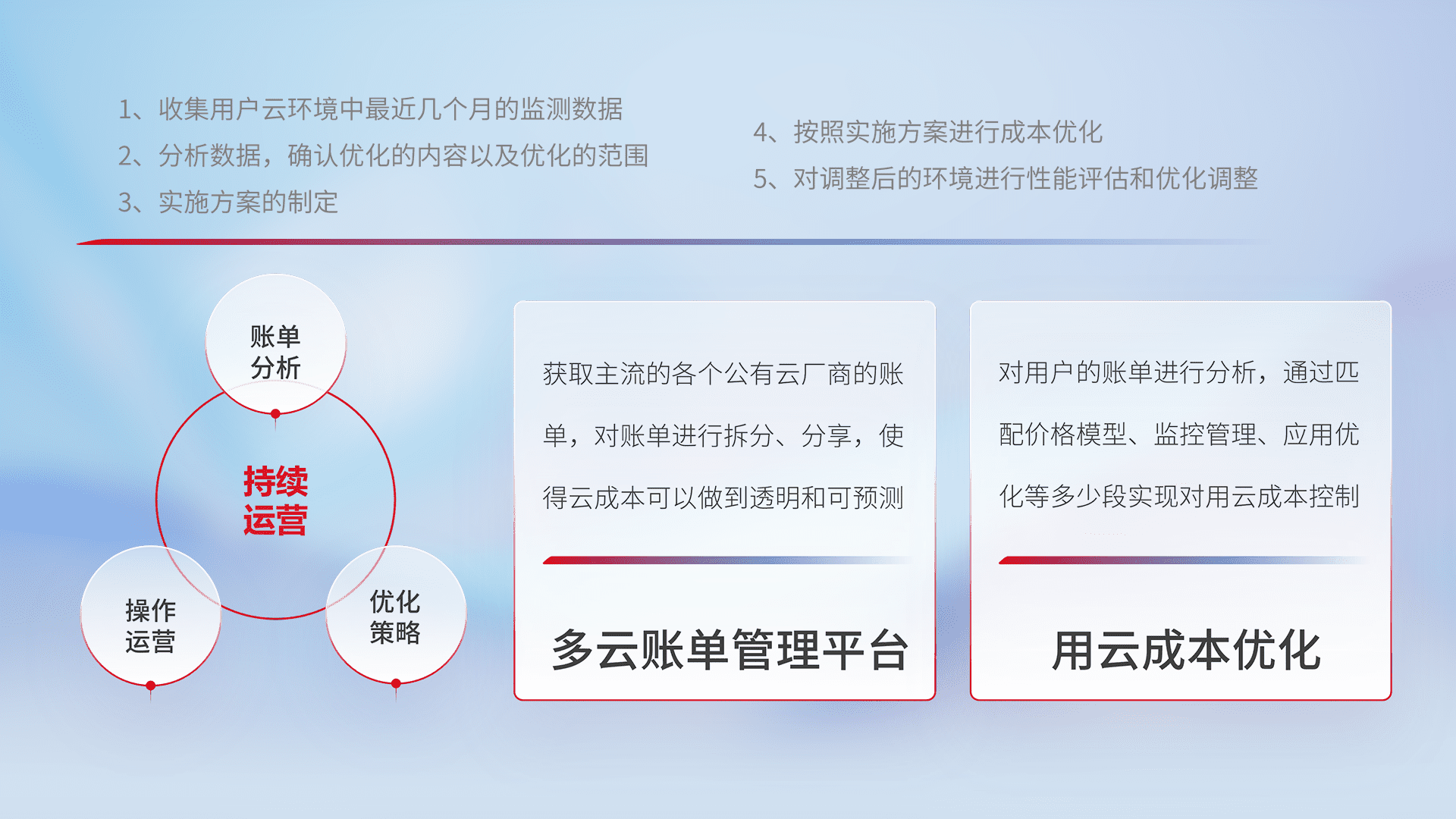 通过多云纳管,,以统一的资源数据模型把客户的云资源进行抽象和封装,,,进而实现对多云资源的统一操作,,保障云资源管理的可靠性、、、稳定性与可用性。。。量身定制化运维内容,,,配置、、、开发运维、、补丁管理、、、备份、、、、监控、、、认证和访问管理、、、审计和日常巡检等,,,,保障在用云过程中的可靠度,,稳定度以及高可用率。。