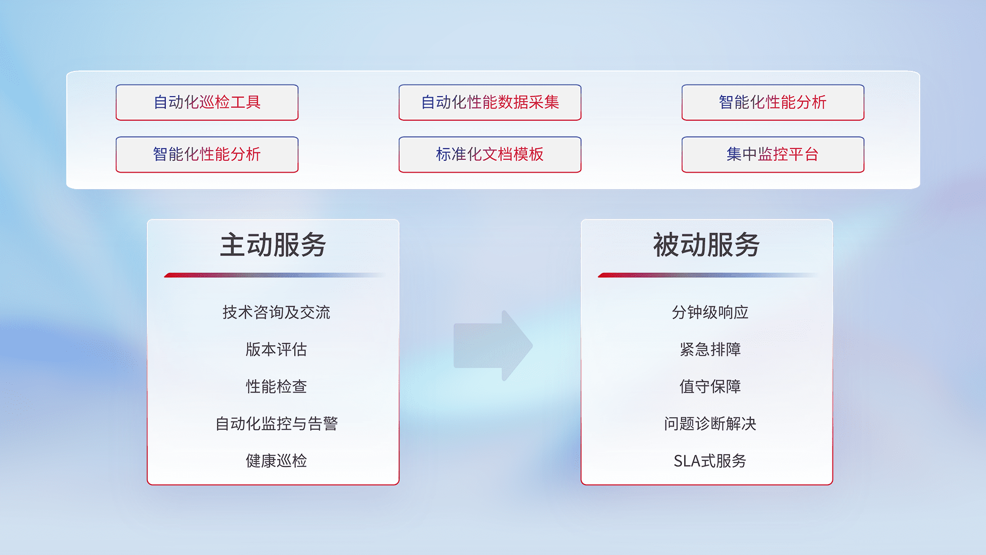 智能化工具和标准化文档,,,,保障服务质量,,,提供主动服务(包含技术咨询、、、版本评估、、、、性能检查、、、自动化监控与告警、、、健康巡检)和被动服务包含(分钟级响应、、、紧急排障、、值守保障、、问题诊断解决、、、、SLA服务)。。